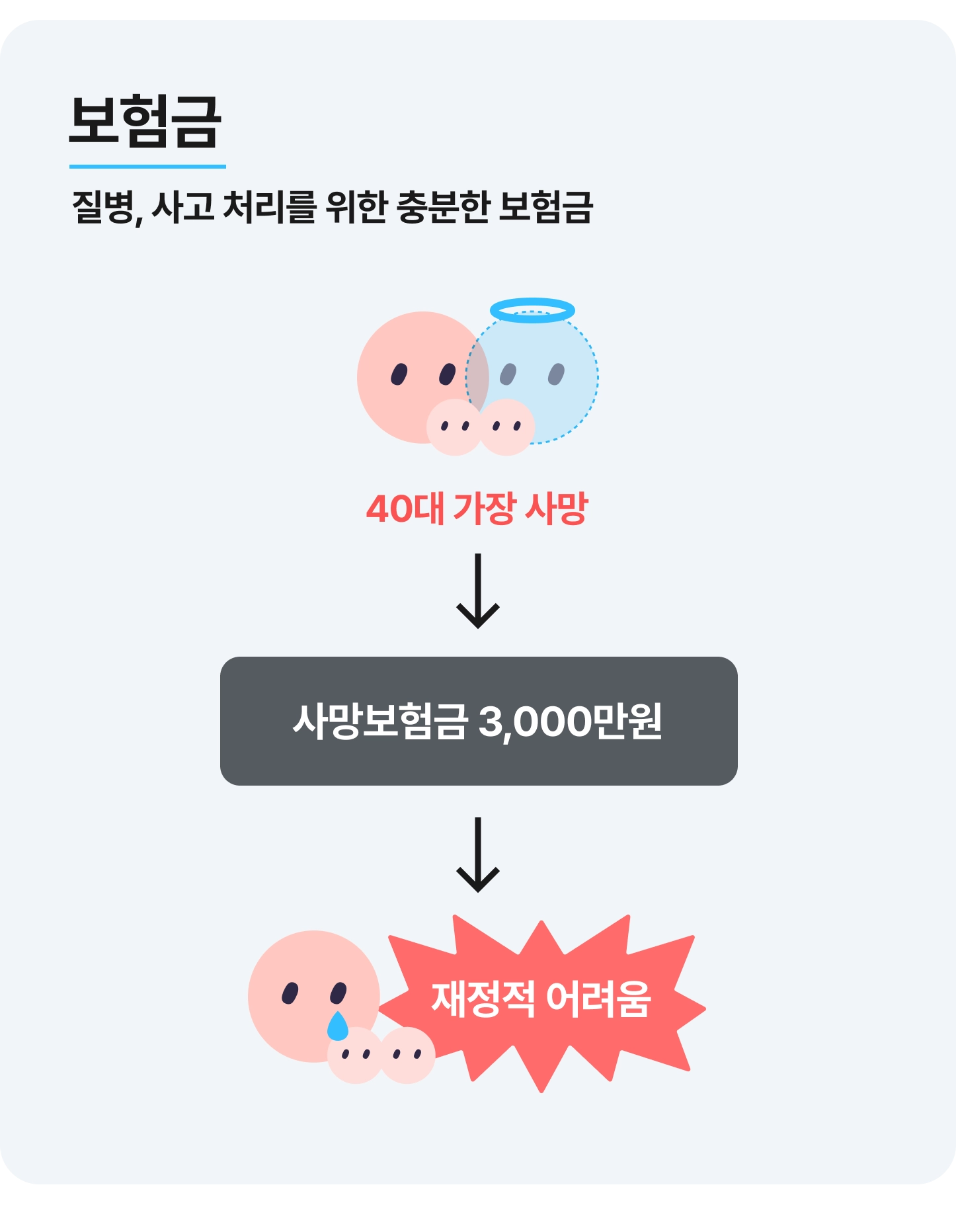 이를 위해 사망보장에 가입 중인데 만약 사망보험금이 3천만 원이라면 너무 부족해 사고를 제대로 처리할 수 없어요. 따라서 보험금이 나오더라도 사고 처리를 위해 충분한 수준인지를 점검하는 것이 중요하죠.