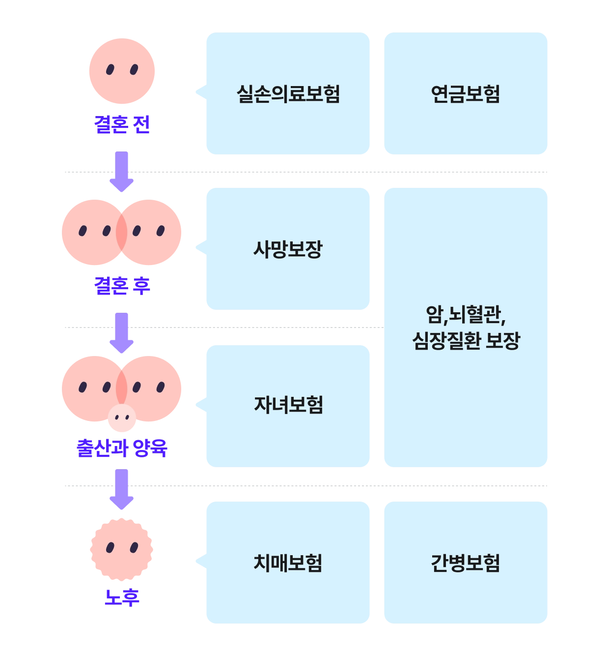 결혼 후에는 책임져야 할 가족이 생겼으니 사망보장 및 아프면 안 되기에 질병 보장 등을 살펴야겠죠.