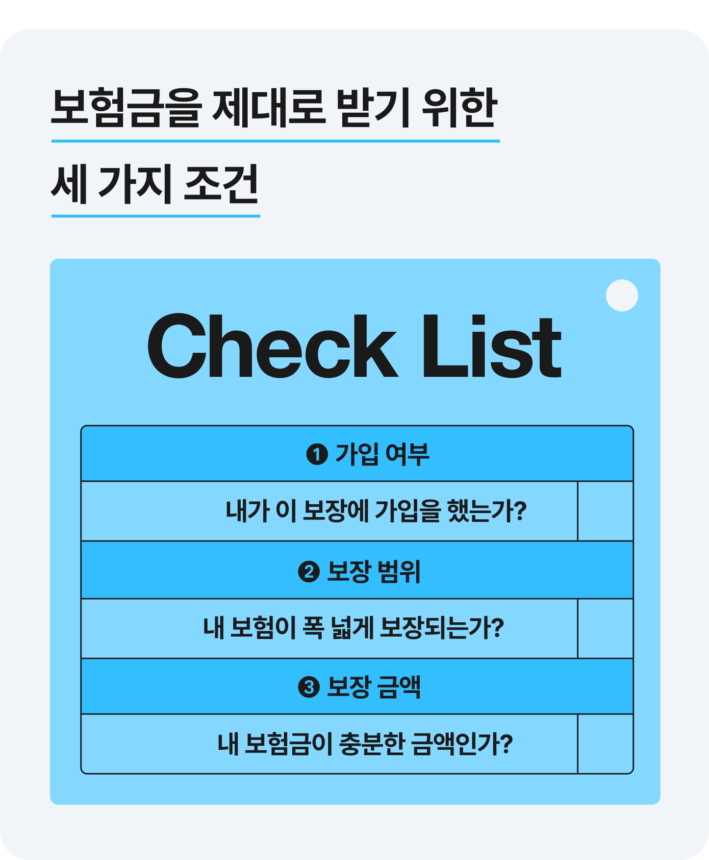 보험금을 통해 사고를 제대로 처리하기 위해서는 가입 중인 보험이 세 가지 조건을 만족하는지 살펴보면 돼요.