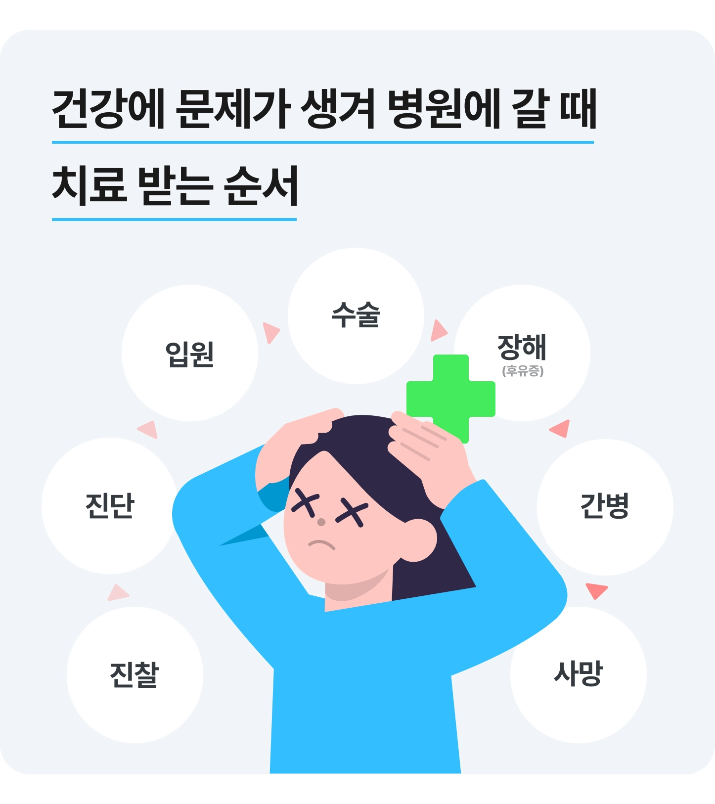 우선 삶에서 건강이 가장 중요해요. 아프거나 다치면 병원을 가는데 진찰 후 진단이 내려지면 입원을 하죠. 이후 수술 등을 통해 치료를 하며 그 과정에서 신체에 장해가 남거나 후유증으로 간병이 필요할 수 있어요. 또 한 번 아프거나 다치면 건강한 사람보다 사망할 확률도 높아지죠.
